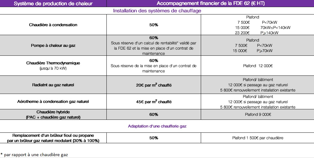 Lorsqu’une collectivité réalise une extension du réseau gaz naturel accompagnée par la FDE 62 (B/I), elle doit, dans un délai d’un an, raccorder les bâtiments de son patrimoine desservis par l’extension au réseau. Dans ce cadre, la FDE 62 propose une aide pour favoriser l’installation d’un nouveau système de chauffage.